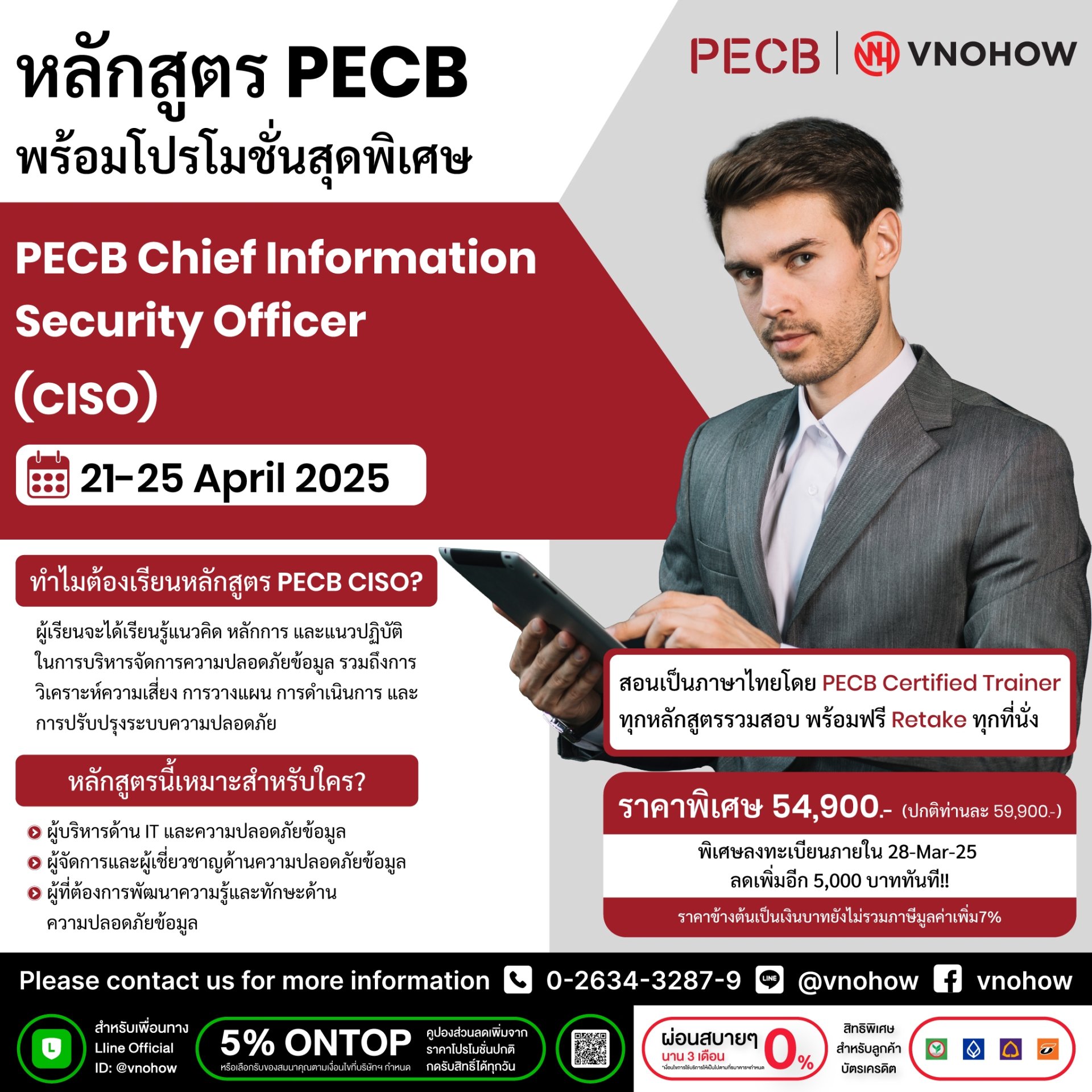 หลักสูตร PECB CISO รวมสอบพร้อม Retake ในราคาสุดพิเศษ! พร้อมลดเพิ่มอีก 5,000 บาท! เมื่อลงทะเบียนภายใน 28 Mar25 นี้