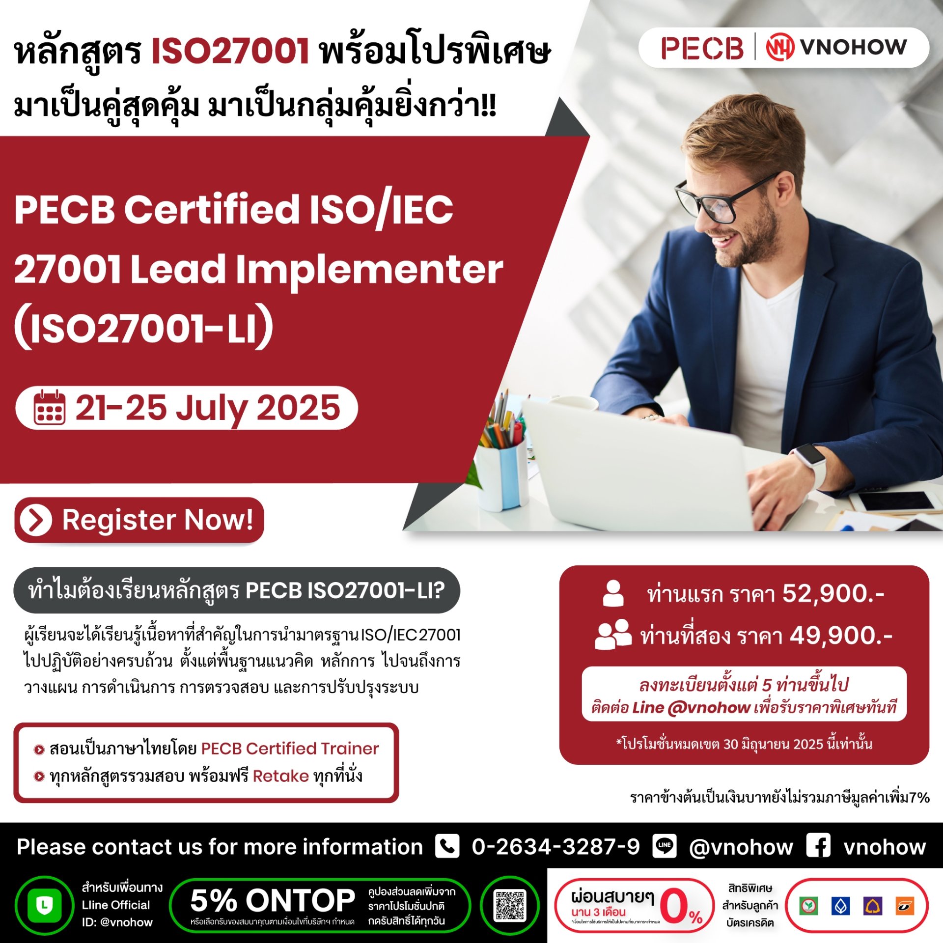 ยิ่งเยอะ ยิ่งคุ้ม!! หลักสูตร PECB ISO27001 รวมสอบพร้อม Retake ท่านแรก 52,900 บาท! ท่านต่อไปจ่ายเพียง 49,900 บาท เท่านั้น!!