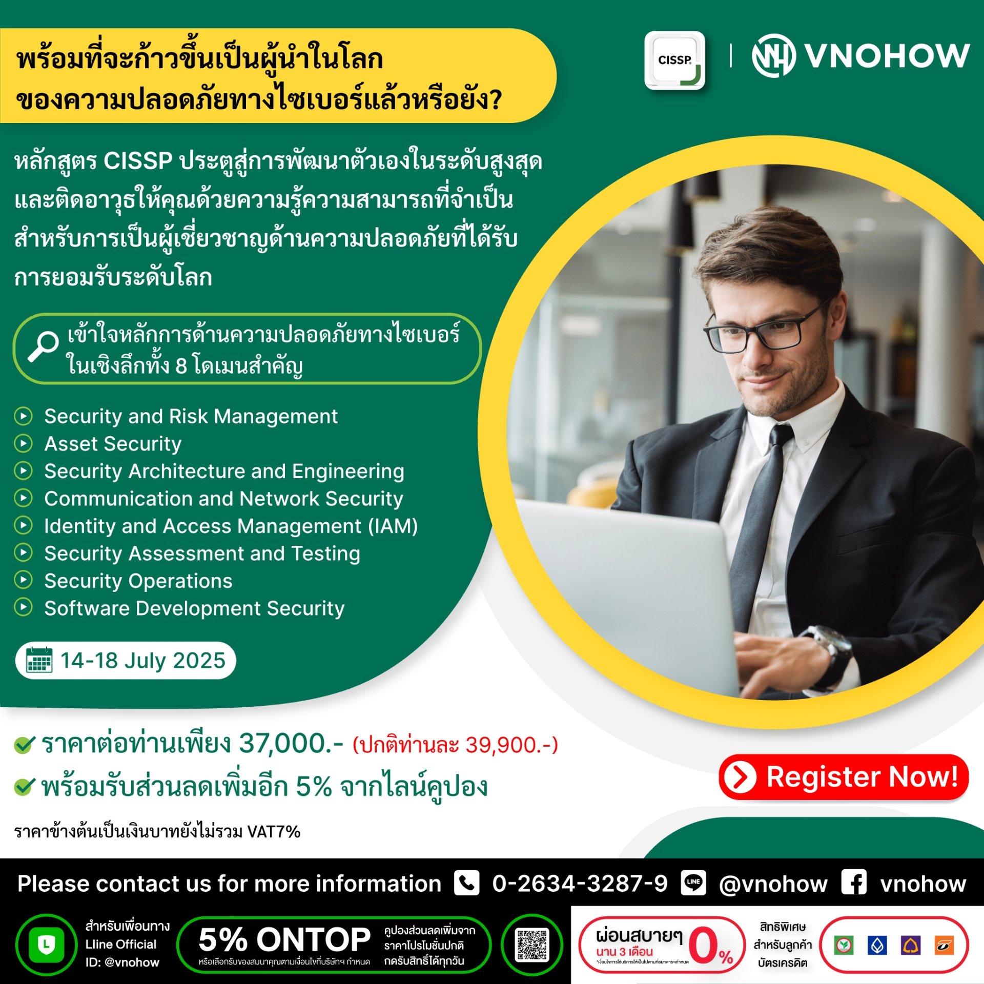 ยกระดับสู่ผู้เชี่ยวชาญด้านความปลอดภัยไซเบอร์ด้วยหลักสูตร CISSP ที่วีโนฮาว! พร้อมรับข้อเสนอสุดพิเศษที่คุณต้องห้ามพลาด!
