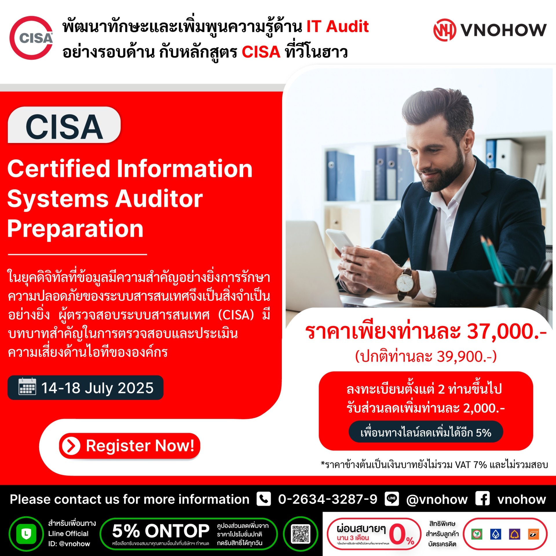 ก้าวสู่การเป็นผู้เชี่ยวชาญด้าน IT Audit ที่ตลาดต้องการ ด้วยเนื้อหาที่เข้มข้น ครอบคลุม และตรงตามมาตรฐานสากล ด้วยหลักสูตร CISA ที่วีโนฮาว