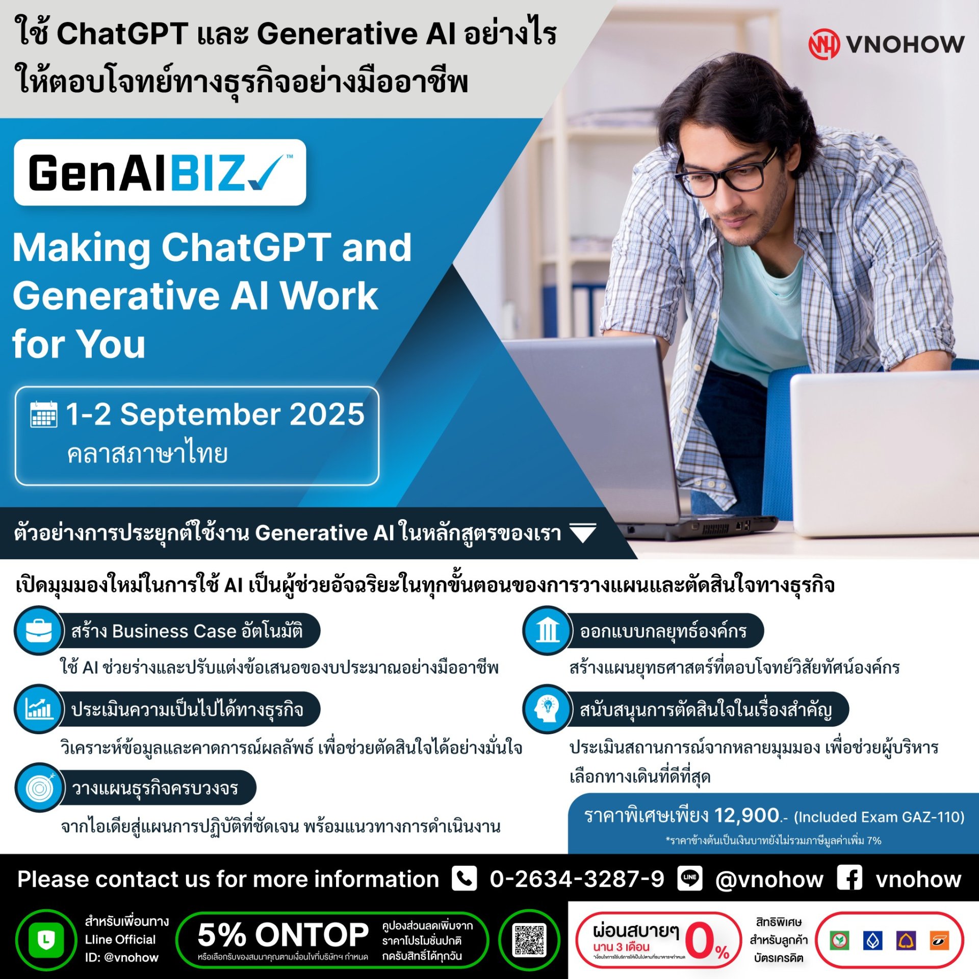 เรียนรู้การใช้ ChatGPT และ Generative AI ให้ตอบโจทย์ทางธุรกิจอย่างมืออาชีพ ด้วยหลักสูตร GenAIBIZ พร้อมสอบ ในราคาเพียง 12,900 บาท!