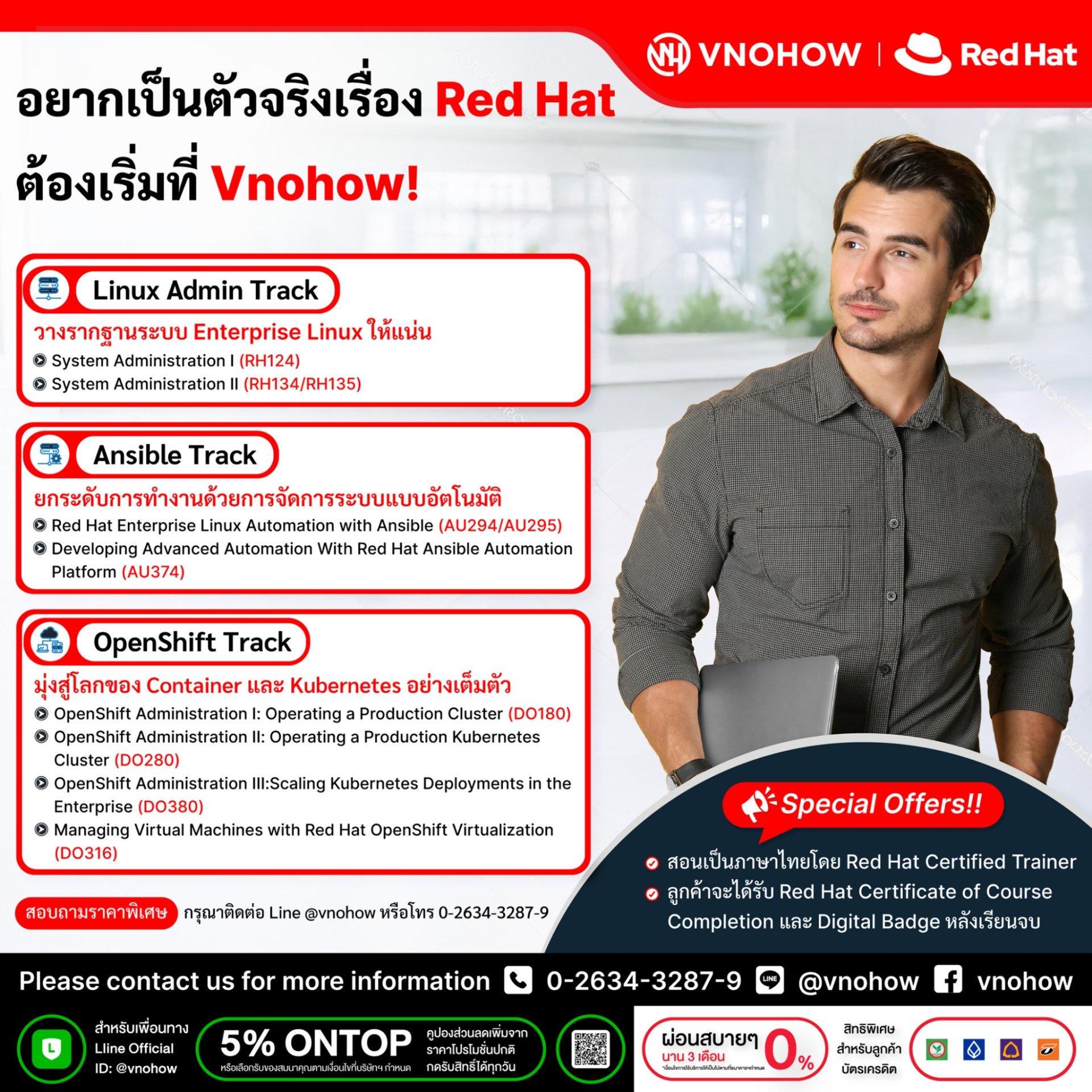 ครบทุกสาย ตั้งแต่ Linux, Automation ไปจนถึง OpenShift & Kubernetes วางรากฐาน Enterprise Linux ให้แน่น ยกระดับการทำงานด้วย Ansible และก้าวสู่โลก Container อย่างมั่นใจ!