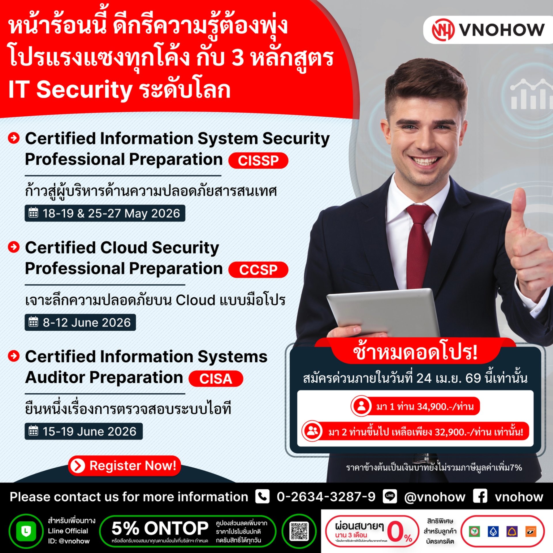 หลักสูตร CISSP , CSSP , CISA พร้อมให้ลงทะเบียนแล้วในราคาสุดพิเศษ และรับส่วนลดเพิ่มพิเศษ เมื่อสมัครเรียน 2 ท่านขึ้นไปภายใน 24 Apr'26 นี้!